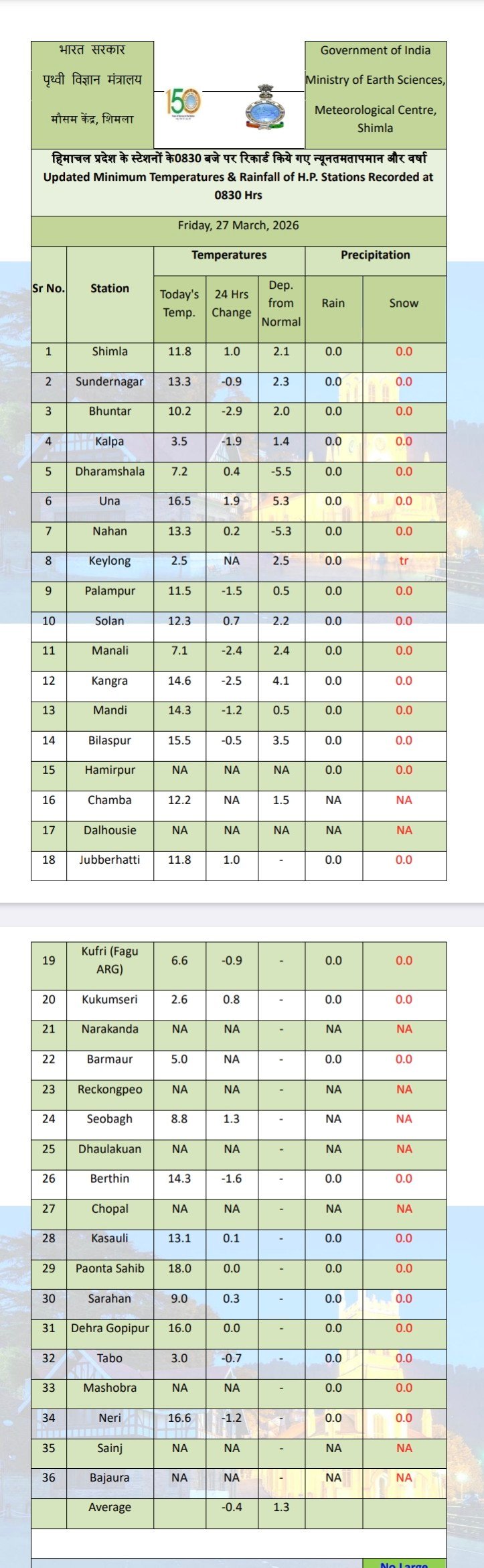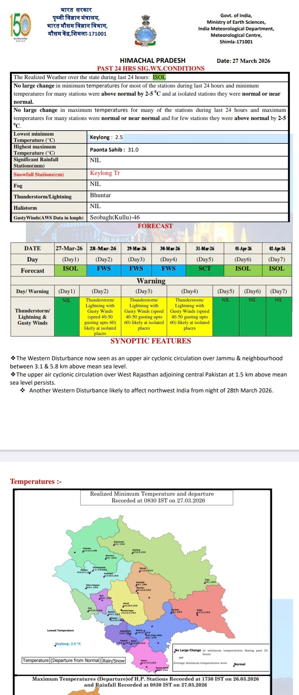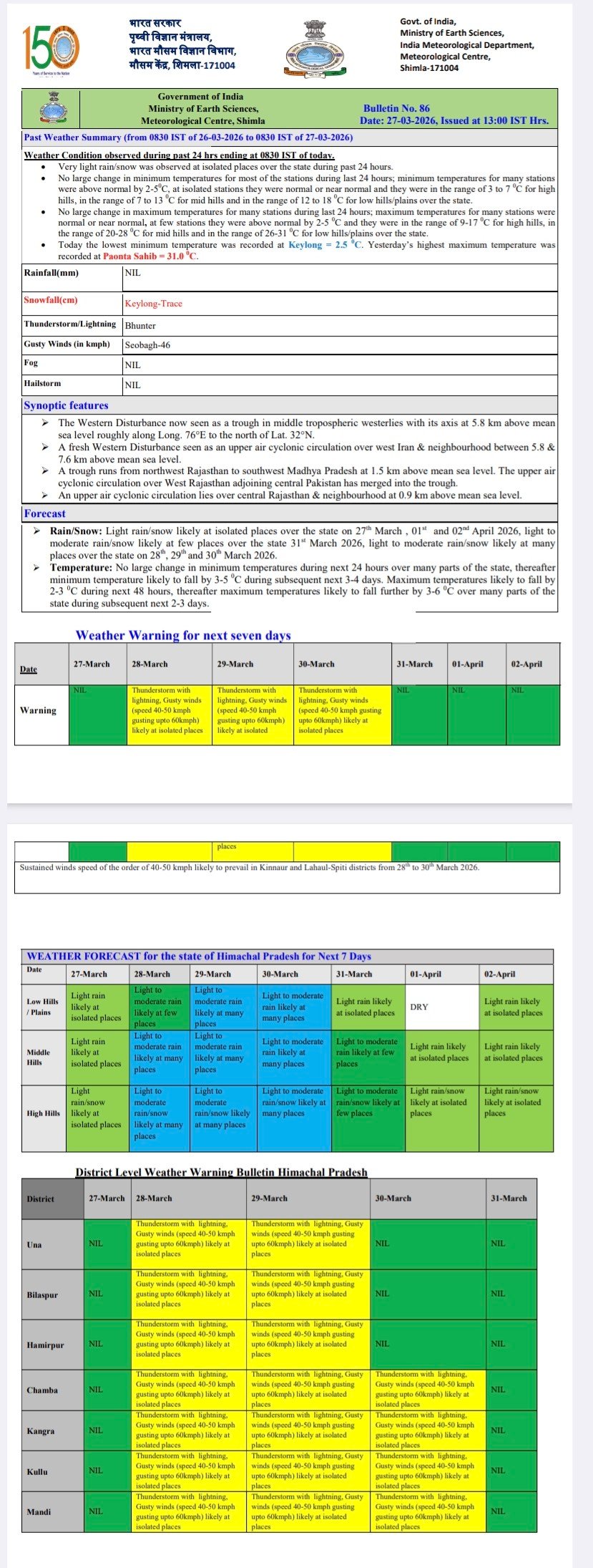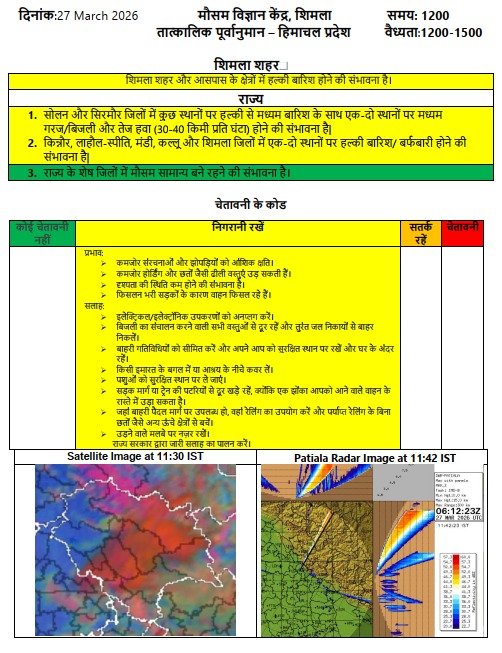 सोलन व सिरमौर जिलों में आज कुछ स्थानों में हवा व वर्षा की संभावना