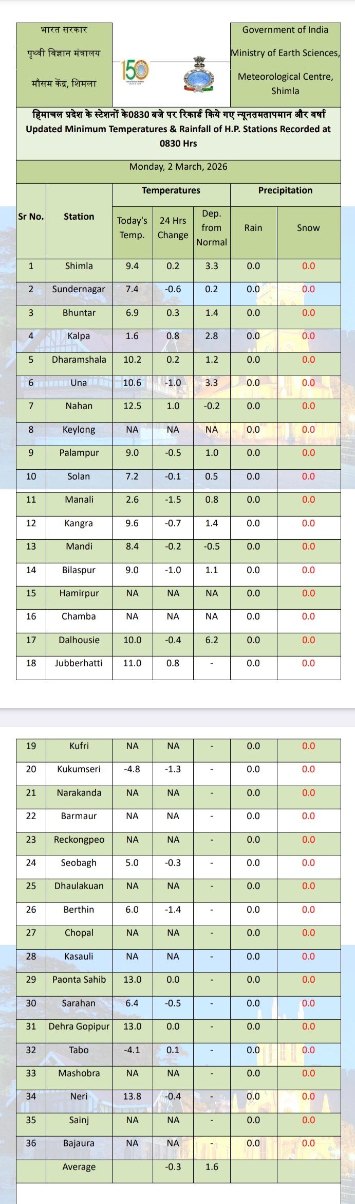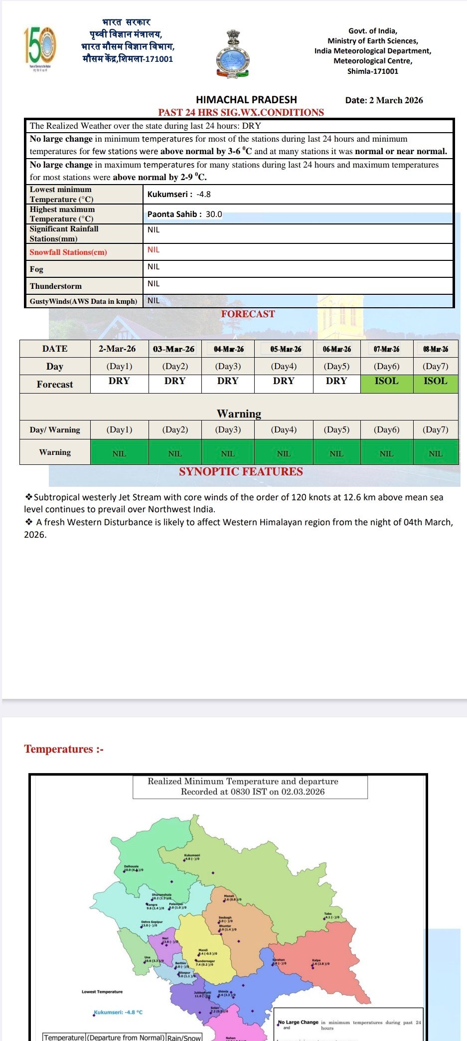 Minimum temperature minus in two places of Himachal