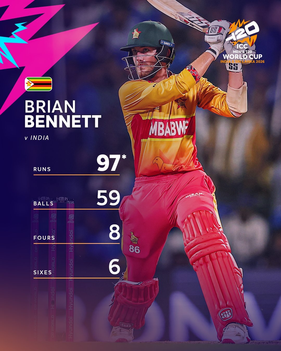 टी-20 विश्व कप 2026 में ज़िम्बाब्वे के ओपनर बल्लेबाज ब्रायन बेनेट (Brian Bennett) ने जबरदस्त रन बनाए हैं। टी-20 विश्व कप 2026 में ज़िम्बाब्वे के आँकड़े इस प्रकार हैं