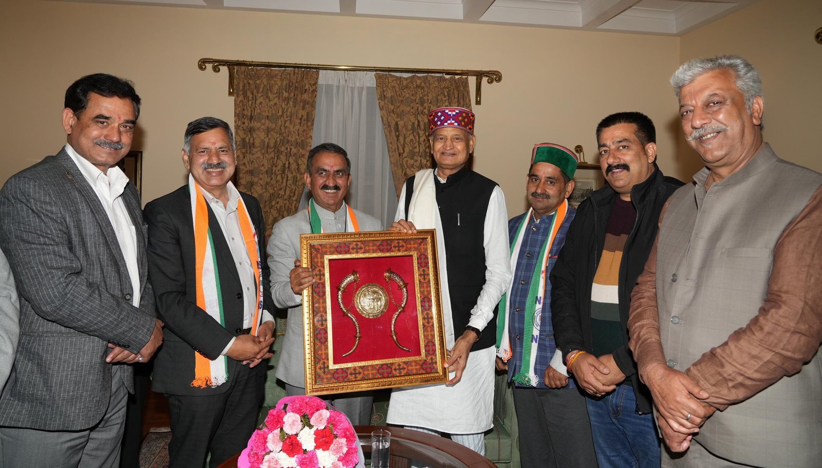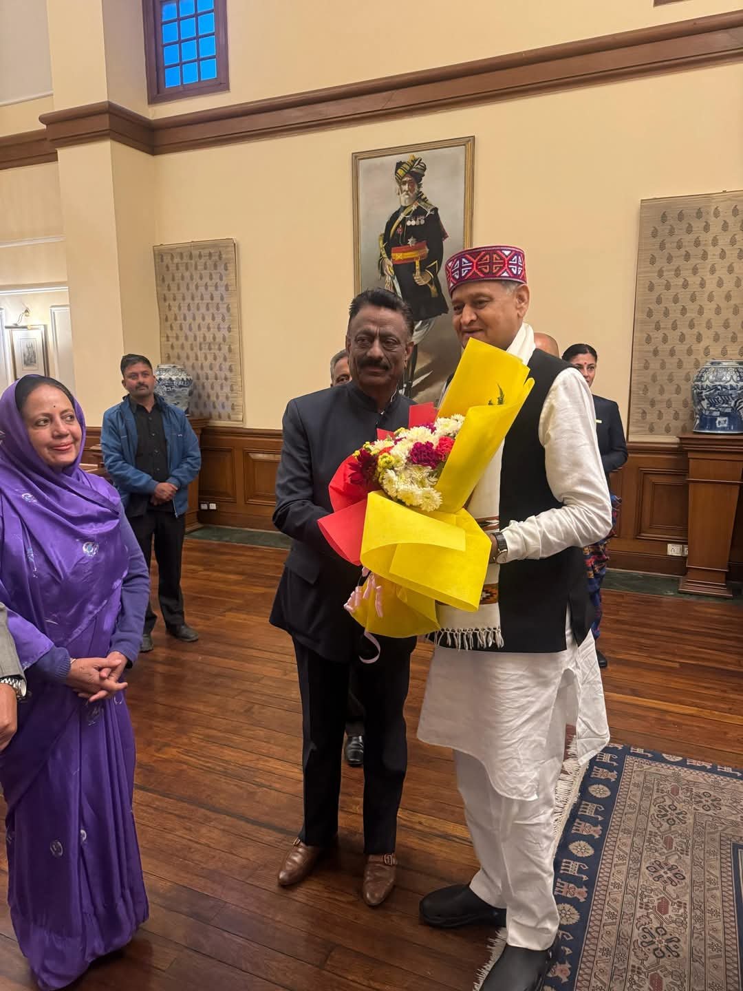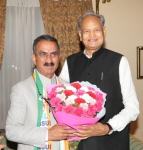 शिमला : मुख्यमंत्री ठाकुर सुखविन्द्र सिंह सुक्खू ने राजस्थान के पूर्व मुख्यमंत्री व कांग्रेस के वरिष्ठ नेता अशोक गहलोत का शिमला पहुंचने पर पुष्पगुच्छ देकर स्वागत किया। उन्हें हिमाचल प्रदेश के पारंपरिक वाद्य यंत्र का स्मृति चिन्ह भी प्रदान किया। इस दौरान तकनीकी शिक्षा मंत्री राजेश धर्माणी, डिप्टी चीफ व्हिप केवल सिंह पठानिया, विधायक संजय अवस्थी, विधायक हरीश जनारथा व विधायक विवेक शर्मा जी मौजूद रहे।