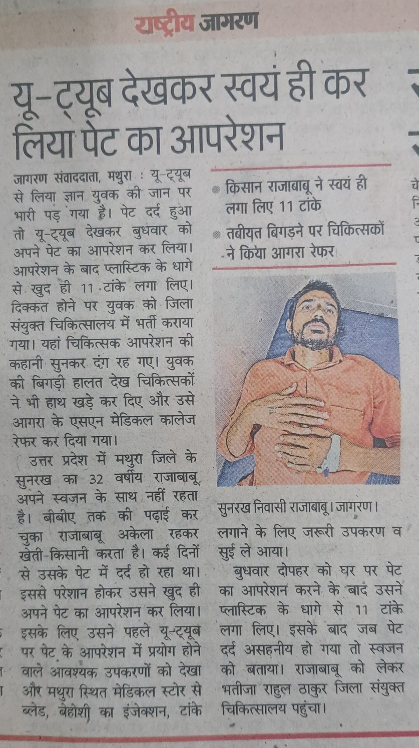 मथुरा में युवक ने यू-ट्यूब देखकर कर लिया अपने पेट का आपरेशन; 11 टांके भी लगा लिए, अस्पताल में भर्ती March 20, 2025