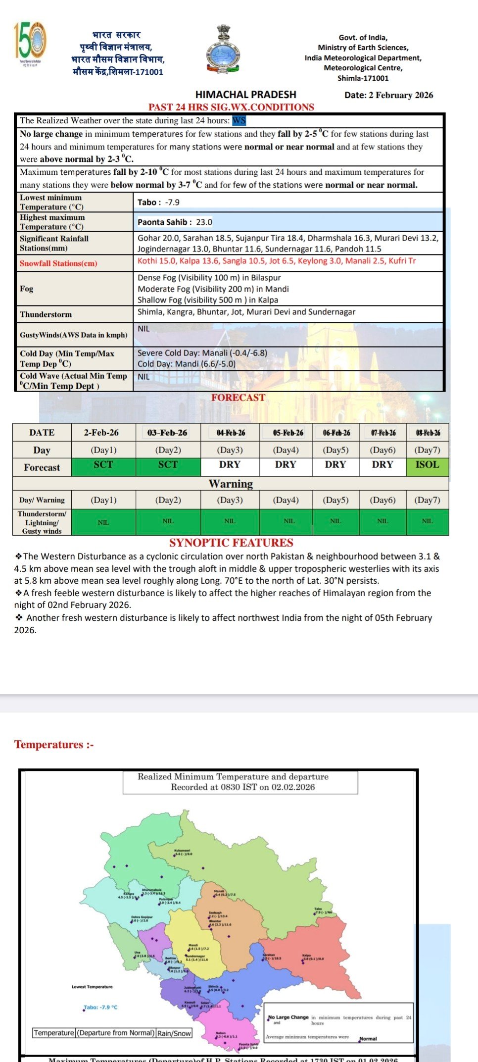 हिमाचल के इन जिलों में रात को वर्षा, हिमपात व हवाएं चलने की संभावना